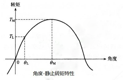 步進電機的線圈通直流電時,帶負載轉子的電磁轉矩(與負載轉矩平衡而產生的恢復電磁轉矩稱為靜態轉矩或靜止轉矩)與轉子功率角的關系稱為角度-靜止轉矩特性,這就是電機的靜態特性。如下圖所示: